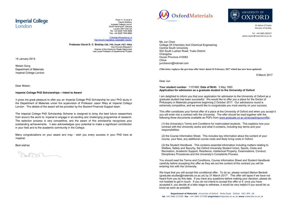如今,两人都在英国留学,宋维鑫说,针对科研这件事,国内外的区别其实不大,只在某些细节方面,会存在细微差别。环境不同,在科研上的思维方式就会不同,“我可以学习到西方创新思维的形成模式,努力在科研过程中做到中西合璧。”图为两人收到的牛津和帝国理工的录取通知。