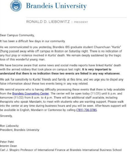 21日(周二)下午,布兰迪斯大学校长再次邮件通报全校,称张川川于18日(周六)晚上在校外身亡,且并非死于暴力。邮件中称,有网络媒体将张川川的死与学校20日(周一)晚发布警报的武装抢劫事件联系在一起,特此澄清,目前没有任何证据暗示两件事有所关联。