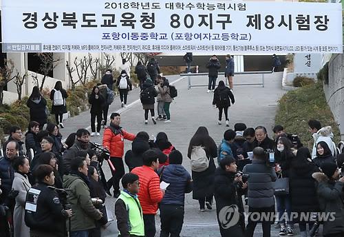 11月23日,在韩国浦项一考点,考生们正进入考场。(韩联社)