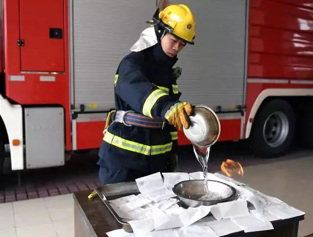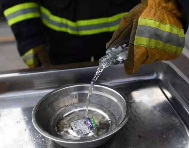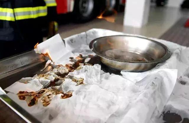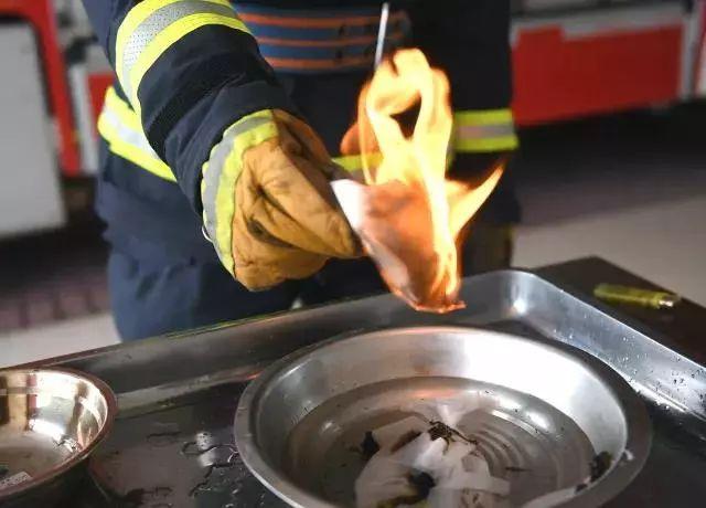 第一个实验结束后,消防员试着用水灭火。为充分体现实验效果,特意在铁碗周边铺上纸巾。当铁碗内的酒精燃烧数秒后,消防员将一碗清水从高处快速倒入燃烧的酒精里。