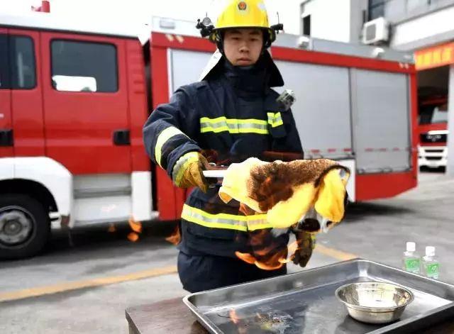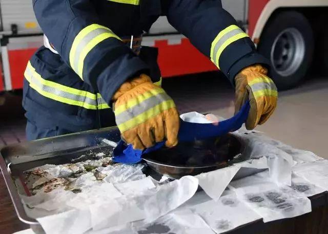 消防员用打火机将酒精点燃后,用一根被干毛巾包裹着的棍子把铁碗打翻,模拟正常用餐时不慎将火锅打翻的情景。