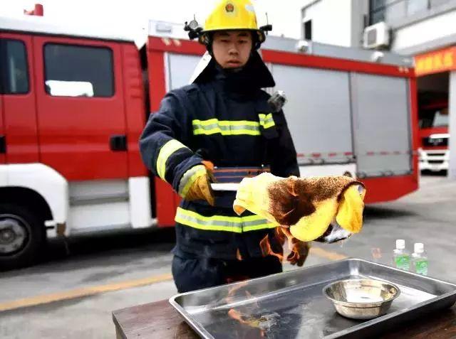 消防员先将带皮猪肉表面的酒精点燃,数秒后,用水雾型灭火剂对着碗内进行灭火。