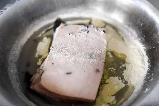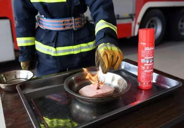 将猪肉表面清理干净后,再次倒上酒精并点燃,然后用干粉灭火器对着碗内进行灭火。