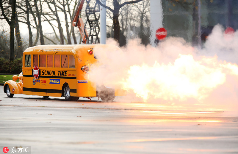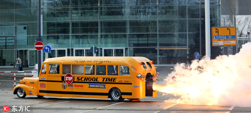 当地时间2017年11月29日,德国埃森市,埃森汽车展预演上,工程师Gerd Habermann为“喷气式校车(school Jet Bus)”点火。