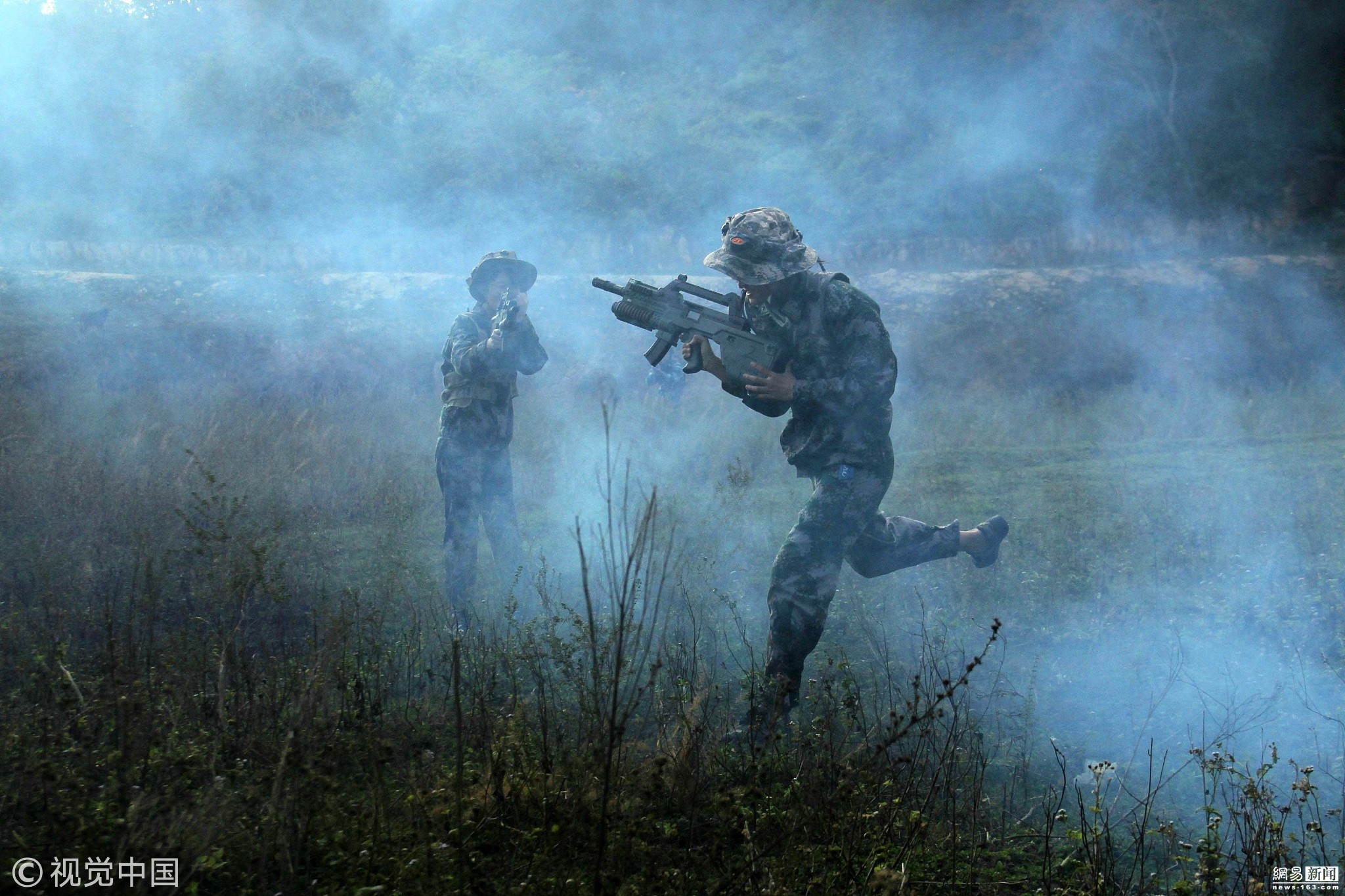 学生参加模拟野战科目,在浓烟中奔跑、射击。