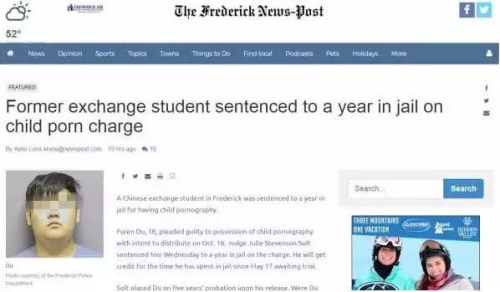 美国马里兰州弗雷德里克县法庭几天前宣判,年仅18岁的中国交换生杜辅仁(Furen Du,音译)被判处一年监禁,其留学签证被注销,出狱后将遣返回中国。