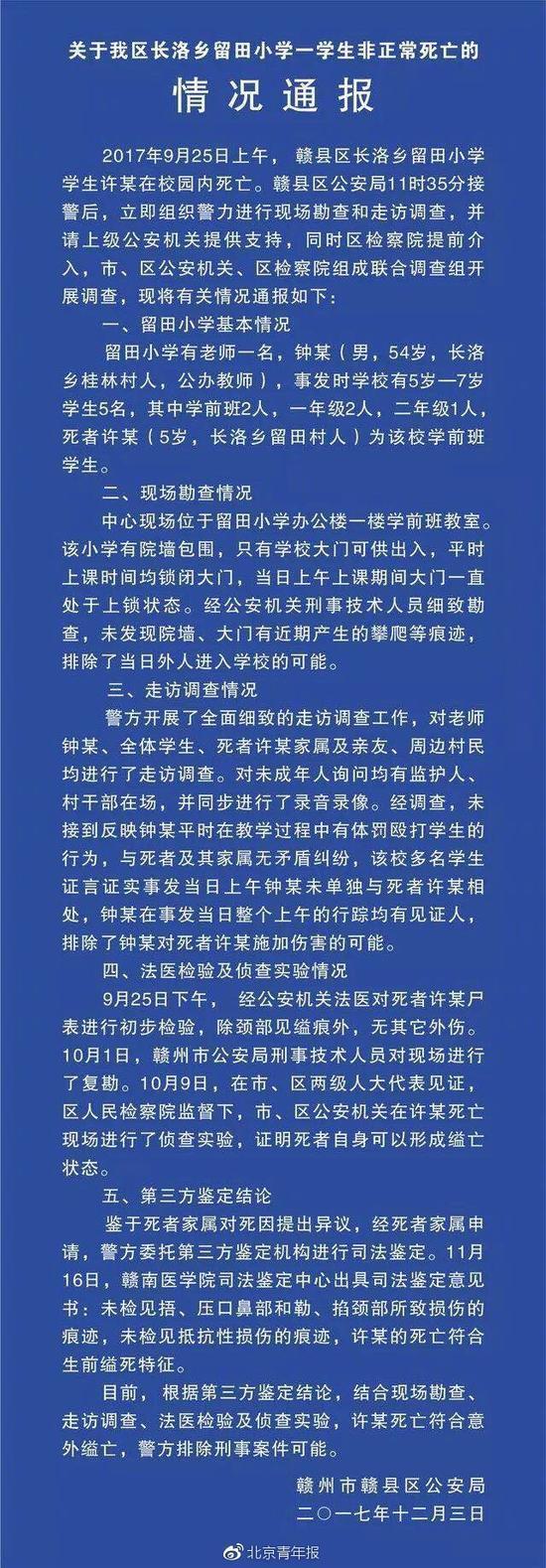 针对此事,今天,北青报记者从赣县区公安局获悉了一份警方通报,通报称,留田小学有老师一名,钟某(男,54岁,公办教师),事发时学校有5岁——7岁学生5名,其中学前班2人,一年级2人,二年级1人,死者许某(5岁)为该校学前班学生。
