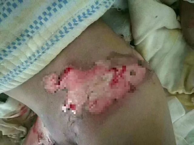 整个阴囊、左右两个大腿内侧、腰部都被大面积的烫伤。创伤部位皮肤大面积脱落,大块鲜红的肉显露在外面,鲜血从边缘浸出,创伤周边的皮肤被烫得发乌……