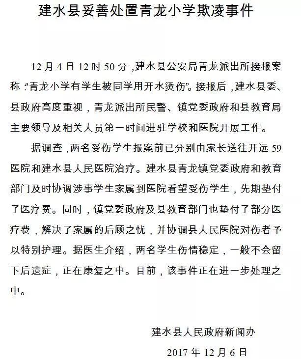 昨天晚上,建水县人民政府新闻办发出通报,称:建水县青龙镇党委政府和教育部门及时协调涉事学生家属到医院看望受伤学生,先期垫付了医疗费。同时,镇党委政府及县教育部门也垫付了部分医疗费,解决了家属的后顾之忧,并协调县人民医院对伤者予以特别护理。