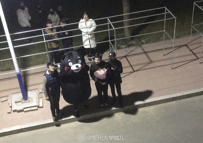 12月7日晚,在河南郑州新郑河南工业贸易职业学院,一男生扮成熊本模样手捧鲜花,在某女生宿舍楼下大喊“安红,我爱你”向女生告白,很长时间由于女生没出来,男生打听到女生宿舍号直接冲女生寝室,结果惨遭保安踹门驱离,告白失败。