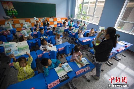 资料图:中国教育部统一组织新编的义务教育《道德与法治》、《语文》、《历史》三科教材,在中国所有地区初始年级开始投入使用。张云 摄