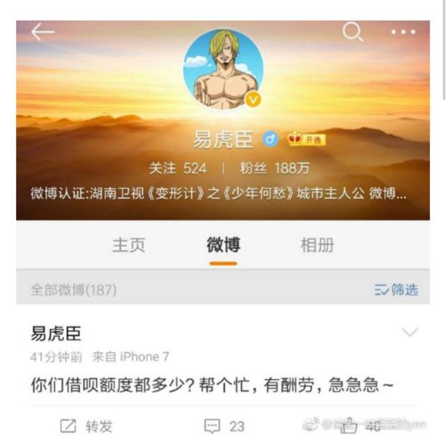 这个很多人眼中的明星人物,前几天又陷入一场借钱不还的风波。他的几位粉丝向记者表示,易虎臣今年2月份左右经常发微博向大家借钱,为了帮助偶像渡过难关,大家纷纷借钱给他,金额从几千元到几万元不等,但到了约定的还款日期,却没有收回欠款。