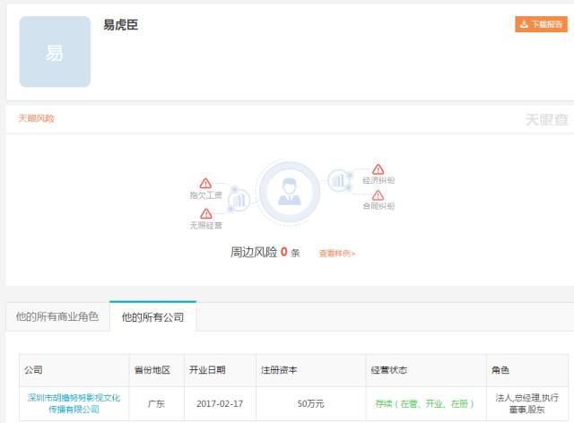 天眼查上的信息显示,今年2月17日,易虎臣注册了深圳市胡撸努努影视文化传播有限公司,注册资金为50万元,易虎臣出资40.00万元,他的合伙人出资10万元。
