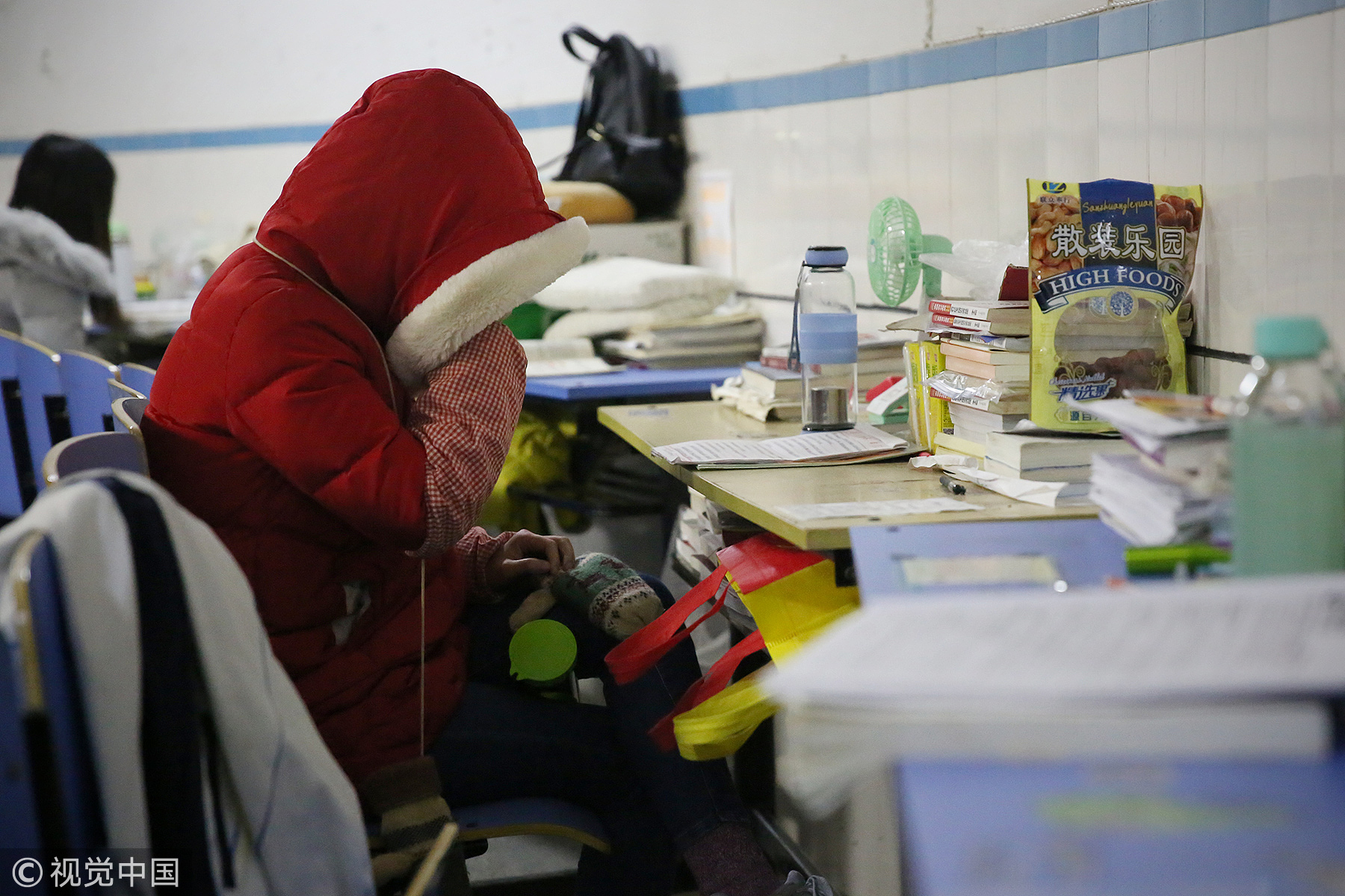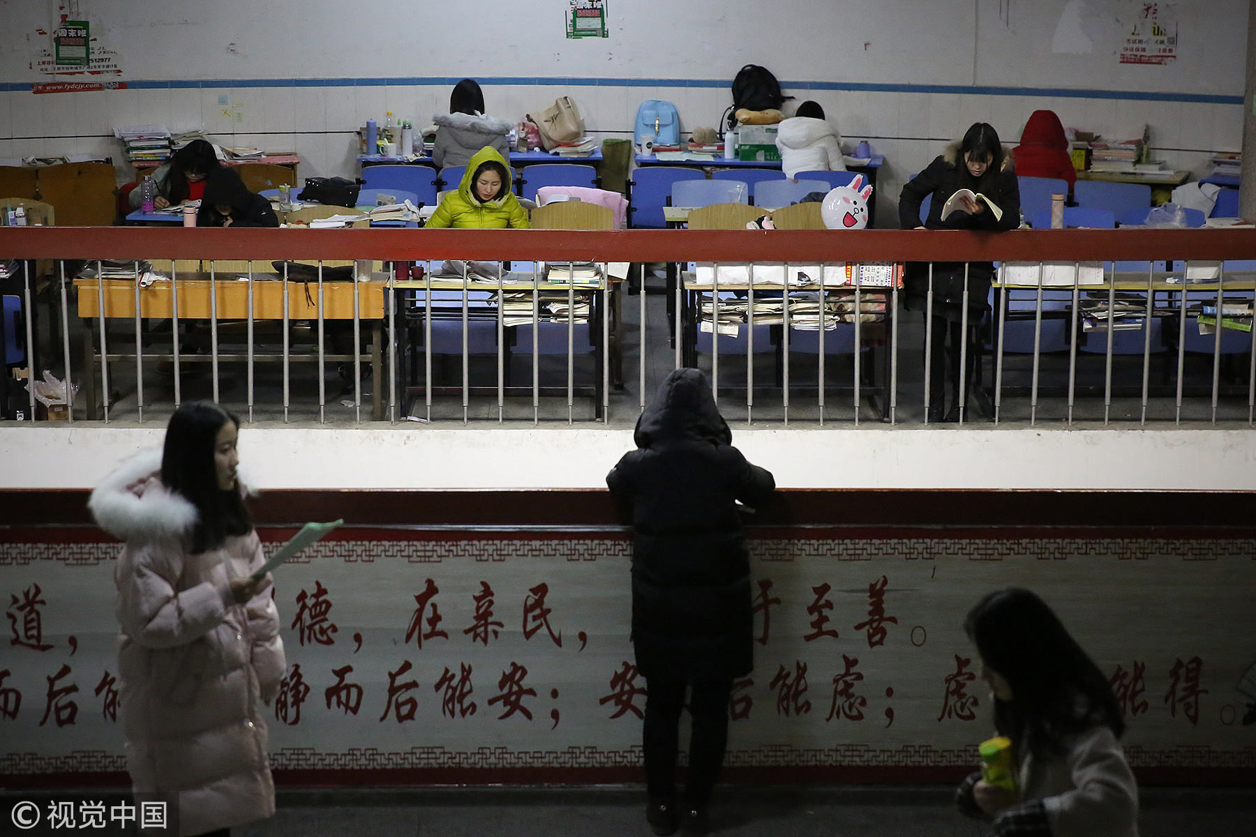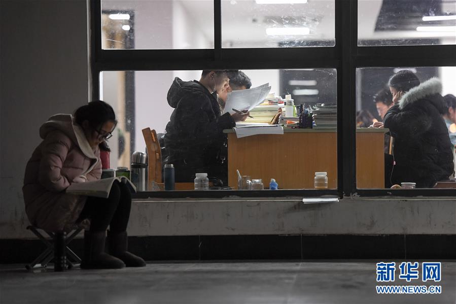安徽阜阳:考研冲刺 零下6度学子“全副武装”楼道苦读。