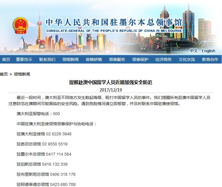 据中国驻墨尔本总领馆网站消息,最近一段时间,澳大利亚不同地方发生数起侮辱、殴打中国留学人员的事件。驻墨尔本总领馆提醒所有赴澳中国留学人员,注意防范在澳期间可能面临的安全风险。遇到危险情况请立即报警,并及时联系中国驻澳使领馆。