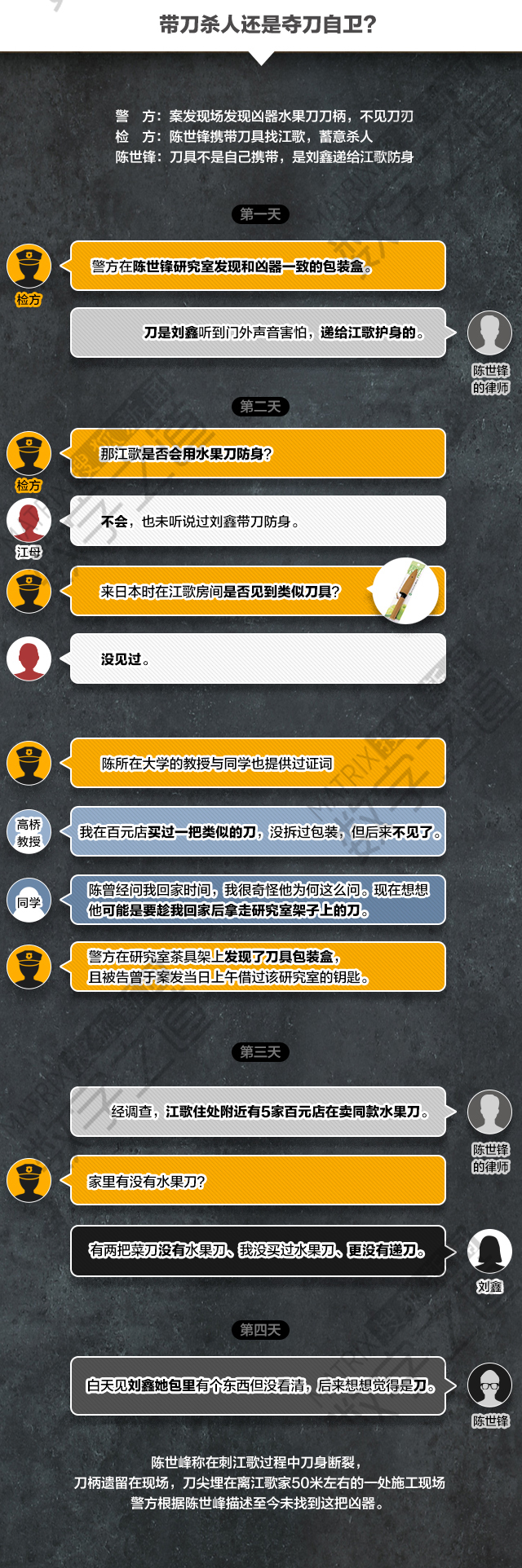 检方认为,江歌身中十余刀,凶手陈世锋杀害江歌的手段极其残忍。而陈世锋一方则坚称杀人非本意,争执中的误伤造成了江歌的死亡。陈世峰律师论辩陈世峰非故意杀人的核心立足点在于“陈没有带刀杀人,属临时起意。”这个观点想成立就要让法官和陪审团相信“杀人的刀是刘鑫所递”。