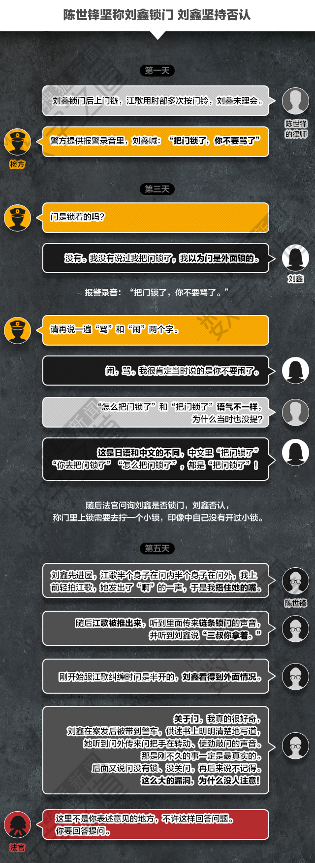 陈世峰律师在论辩中几度质疑刘鑫证词的可信度,庭审最后一天,他根据刀柄的清洁状况与当晚的时间线推断刘鑫曾清洗过掉落现场的刀柄并放回,目的就是抹去(递刀)指纹。
