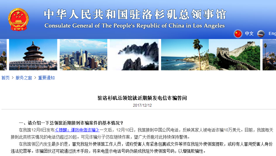 驻洛杉矶中领馆日前发布多次提醒,在领区内发生最多的是冒充驻外使领馆工作人员,谎称受害人有紧急包裹或文件等须在驻外使馆提取,或谎称受害人身份被盗用。诈骗团伙还会将来电号码伪装成领馆电话号码,增强欺骗性。