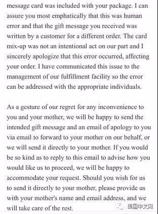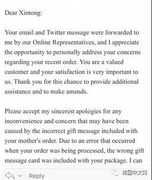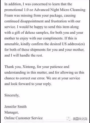 确认不是自己搞错后,震惊的她给化妆品公司官方发了信件并拍照。很快化妆品公司的回复来了,包含三层意思:“首先,我们可能放错了卡;其次,我们可以给你母亲直接发邮件道歉;最后,会把忘了发送的洗面奶小样一并给邮递了。”