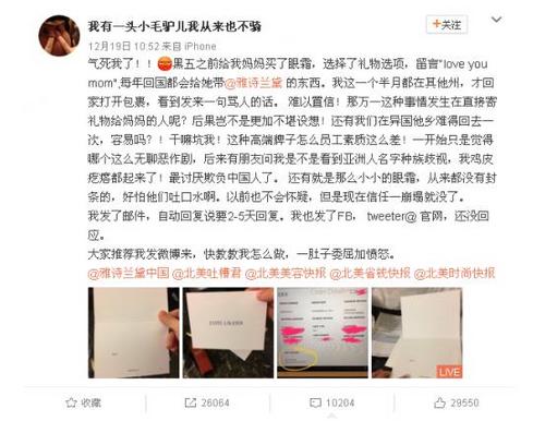 综合美国《侨报》、美国中文网等华媒报道,有网友@我有一头小毛驴儿我从来也不骑 在微博上爆料,近日,她在美国化妆品品牌雅诗兰黛的官网给妈妈买了一件礼物,希望在卡片写上“love you mom”。结果,收到的卡片上却写着“FCK U”,博主怀疑对方种族歧视。