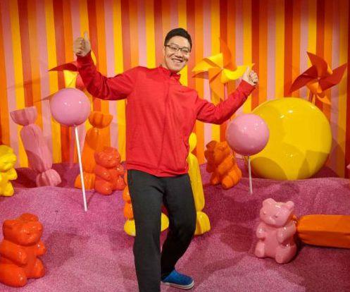 戴杰业余生活颇丰富,图为他在旧金山冰淇淋博物馆留影。(美国《侨报》)