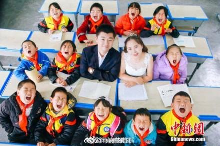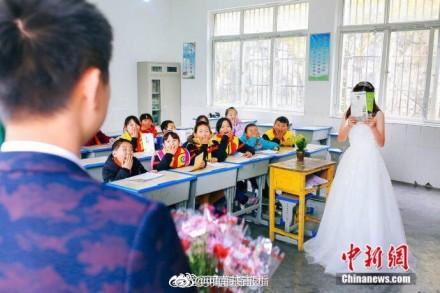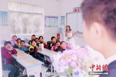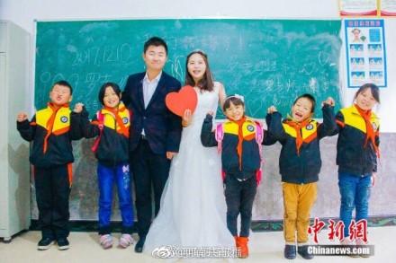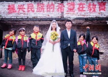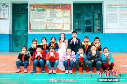 贵州90后乡村教师罗忠花准备2018年1月结婚,她和男友及12名学生在村小学的各个角落拍了一组特别的婚纱照。罗忠花说,婚纱照虽没有别人的梦幻漂亮,但对自己来说是最有意义的,想让更多人能关注留守儿童。祝福美丽的罗老师!