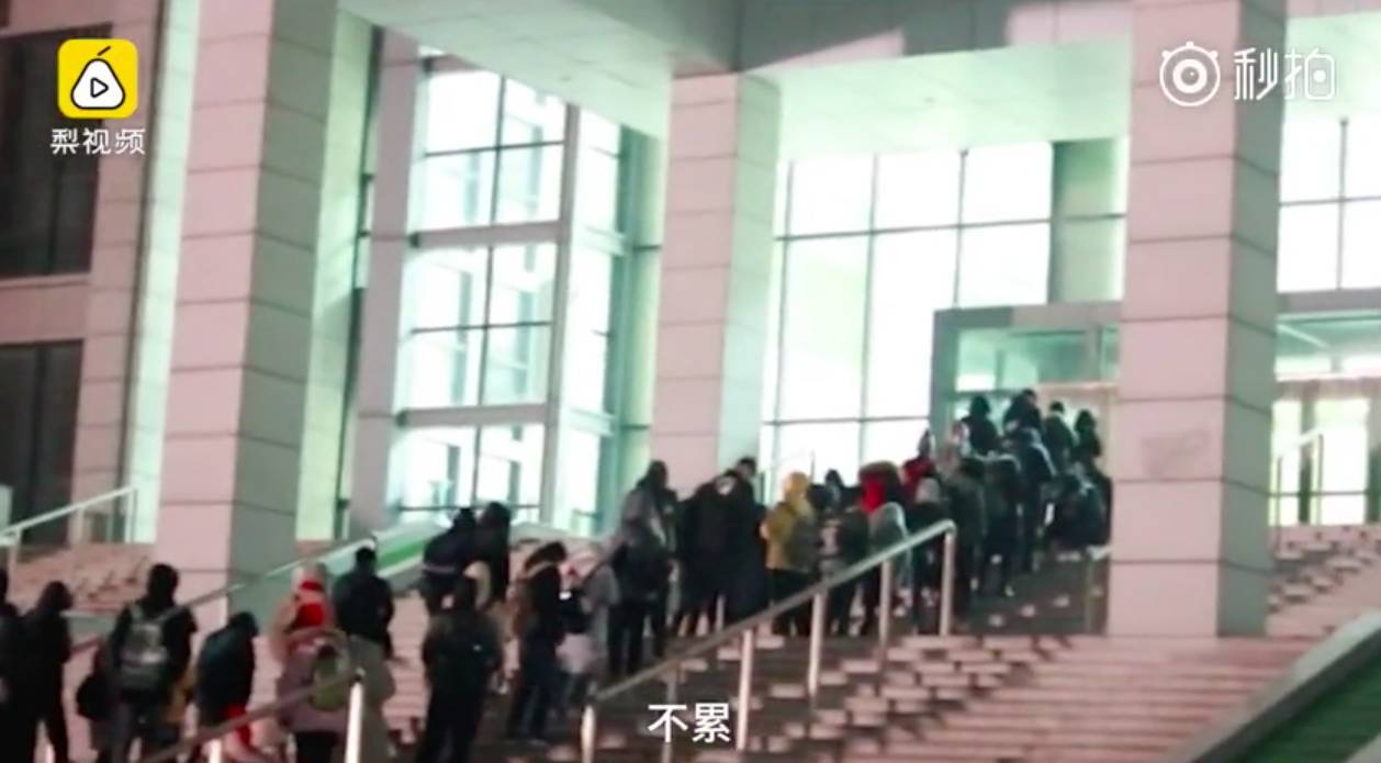 考研学子冒着寒风,在图书馆门口排起长队,等待进去自习。