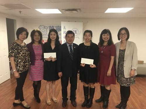 李素英(左三)和李晓璐(右三)获2017年美国华裔注册护士协会奖学金。(美国《世界日报》/记者 牟兰摄)
