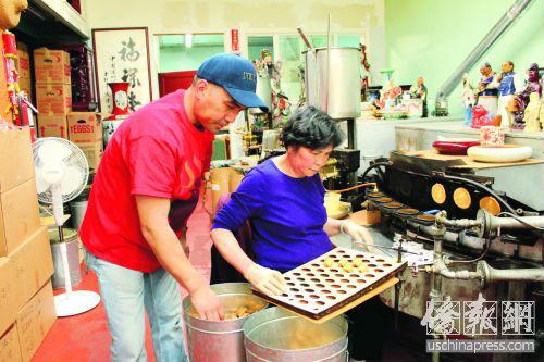 陈展明(左)既是母亲的守护者,更是金门饼食公司的守护者。(美国《侨报》/ 陈勇青 摄)