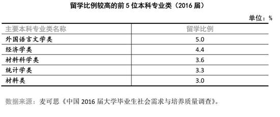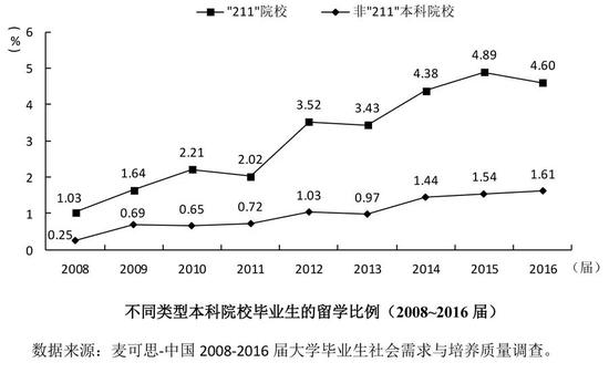 报告显示,我国本科毕业生出国留学比例在过去十年间基本呈稳步上升趋势,211院校出国留学生高于非211 ,但2016年,“211”院校的本科毕业生留学比例较前一年有所下降。与往年相比,2016年“211”院校本科毕业生的留学目的更趋务实,且留学回国意愿达到三连增。外语、经济、材料等专业出国比例最,工商管理专业最受偏爱。相较大洋洲和欧洲,北美与亚洲对目标学历的要求更高;留欧的学生归国意愿更高,而大洋洲的最低;本科留学生家庭状况与留学信息获得渠道等方面都呈现出较大的区域差异。