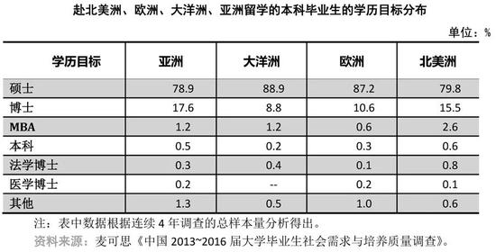 报告显示,赴北美洲、亚洲留学的本科毕业生选择博士作为学历目标的比例明显高于大洋洲、欧洲。另外,赴北美洲留学攻读MBA的比例为2.6%,高于亚洲的1.2%、大洋洲的1.2%、欧洲的0.6%。而本科毕业生留学北美主要看中的是教育质量,即学习先进的知识和技能。