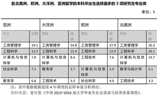 工商管理学是连续数届赴四大洲的本科毕业留学生最受偏爱的专业。在大洋洲、欧洲、北美洲、亚洲四大洲留学的学生中,选择该专业的学生比例分别占54.8%、37.9%、26.3%、19.1%。赴北美洲的学生选择工程科学的比例最高,超过1/4,赴大洋洲、亚洲、欧洲留学的学生选该专业的较少,分别为占15.4%、13.3%、12.9%。