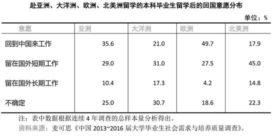 报告显示,从整体上看,各地区留学生准备毕业之后回国或短期工作之后回国的比例均超过50%,这说明本科毕业生在海外毕业之后回国的意愿仍较明显,其中,赴大洋洲留学的本科毕业生归国意愿最低,仅有21%,明显低于亚洲、欧洲和北美洲。