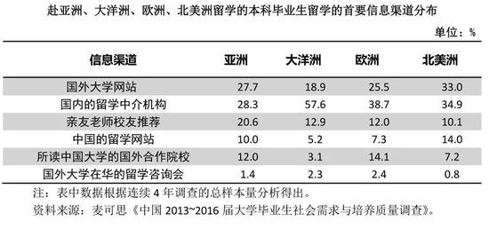 CCG课题组在于2013~2016届本科毕业生出国留学的信息获取渠道的调查中发现,“国内留学中介机构”与“国外大学网站”成为留学生获取留学信息的主要渠道,两者在大洋洲、北美洲、欧洲及亚洲的占比均超过50%,依次为76.5%、67.9%、64.2%以及55.5%。从洲际分布看,大洋洲留学信息渠道构成最为单一,留学中介成为留学信息获取的主要方式,占比高达57.6%,而包括亲友推荐、留学网站以及中外合作办学项目等在内的其他信息获取方式占比总和不足25%。这与以澳大利亚为代表的大洋洲国家已形成较强的移民留学中介产业有较大关系。尽管移民政策出现收缩趋势,澳大利亚一直是留学移民的重要选择,而留学中介往往能为留学生提供涵盖移民规划更为专业的服务。