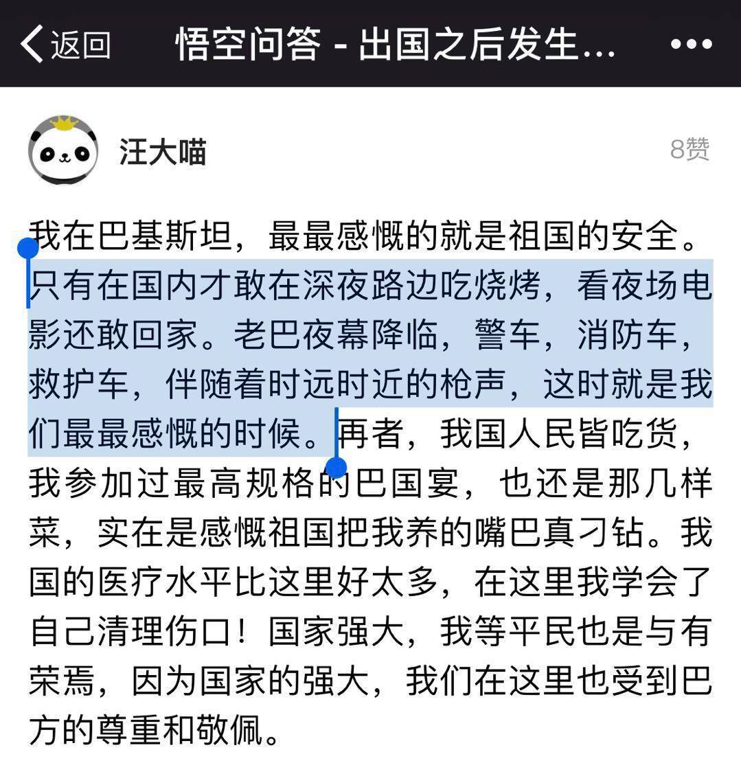 我在巴基斯坦,最最感慨的就是祖国的安全。只有在国内才敢在深夜路边吃烧烤,看夜场电影还敢回家。老巴夜幕降临,警车,消防车,救护车,伴随着时远时近的枪声,这时就是我们最最感慨的时候。