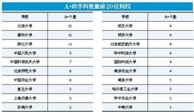 北大、清华以21个A+级学科并列榜首