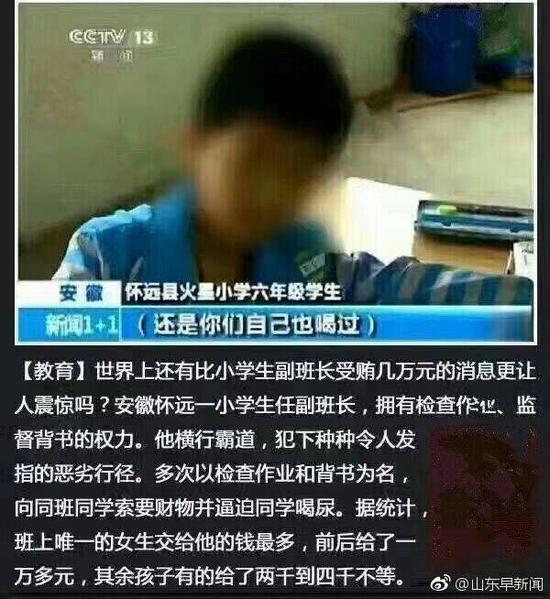 导读: 作为一名副班长,拥有检查作业、监督背书的权力。他多次以检查别人作业,学习进度为由,逼迫其他学生吃屎喝尿,收受其他学生“贿赂”几万元,一个女生给的最多,高达1万,其他人几千不等。