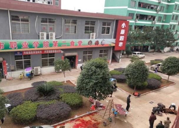 2017年12月30日报道,一名声称就读湖南长沙市当地某职业学院的学生,周五(29日)在社交媒体发贴称,在学校放元旦假期前夕,教学楼附近上演了一场血腥的杀牛事件。