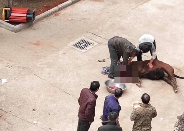 从发贴者发布的照片所见,在“都市职业学院第二食堂”前方的空地上,两名男子正在宰杀牛只。现场所见,牛已被杀,满地鲜血,不远处还有大滩的血水,十分恐怖,其中一名“刽子手”骑在牛身劏宰,而在场还有不少人围观。