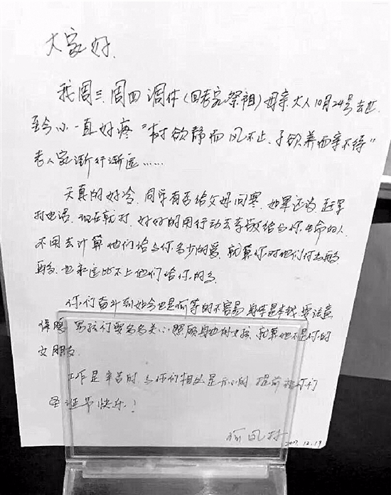 有学生透露,何师傅很爱他的母亲,曾陪母亲去普陀山,只为了却她的夙愿。母亲去世后,他的内心一直都很沉重。12月19日那天,因为要返乡祭祖,他特意在下班前给师生们写了一张请假条,虽然仅短短几百字,一个“疼”字却朴素地诠释了什么叫爱之深切。