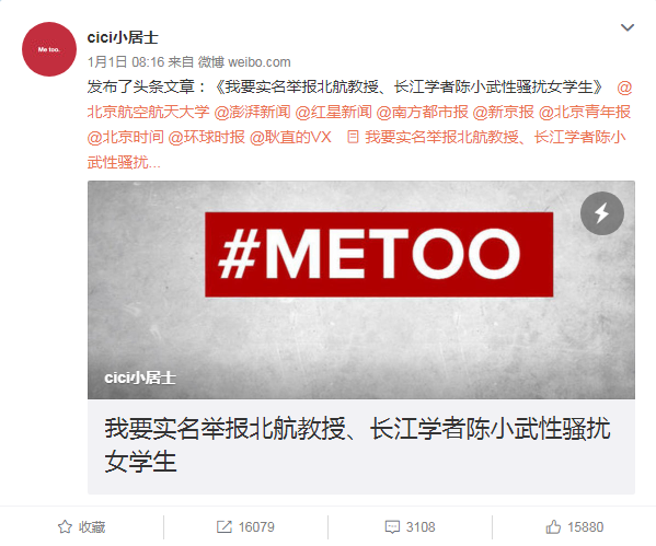 【华南在线教育综合报道 记者 陈全】据红星新闻报道,2018年第一天,美国硅谷华裔女学者罗茜茜在网上实名举报北京航天航空大学博士生导师、长江学者陈小武。其称,12年前在北航读博期间,曾被自己的副导师陈小武性骚扰。“最终决定说出这个秘密,是偶然间在网上看到,我的学妹们依旧在被他性骚扰。”她成立了一个微信群,把有着同样遭遇的北航毕业女生聚在一起,“根据证词,还有手上其他证据,间接证明被骚扰的女性,加上我一共已经有7位了。”罗茜茜告诉记者,她们当中,有的被要求在聚会上和陈小武喝交杯酒;有的被陈小武要求“做我的女朋友”;还有的也曾听到陈小武“与妻子感情不好”的抱怨……罗茜茜表示:“疑似他曾导致手下女学生怀孕,并企图用钱来封口。”1日,北航在官方微博上发表声明,称已第一时间成立了工作组,迅速开展调查核实,并已暂停陈小武的工作。