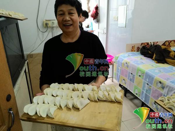 图为宿管阿姨展示包好的饺子。中国青年网通讯员 李蕙君 摄