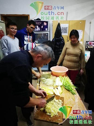 图为宿管叔叔剁馅为包饺子做准备。中国青年网通讯员 李蕙君 摄