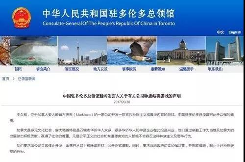 中国驻多伦多总领馆发布声明,表示凡是公平正义的社会和有道德良知的人都绝不会容忍这种种族主义及辱华行为,并要求该公司立即停止开发、出售并从网上移除该游戏,公开正式道歉。