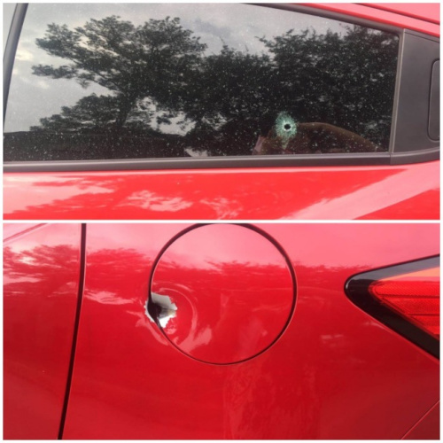 金女士见状后随即倒车并高速回转逃离现场,没想到歹徒竟然对着驶离的车辆连开数枪,子弹一枪一枪打在车上,弹孔清晰可见。金女士事后检视车辆弹孔发现,车辆正后方玻璃、右侧车门、行李箱、油箱盖、甚至驾驶座后方玻璃共有六个枪弹孔,目前警方仍在对事件进行调查。(郭宗岳)