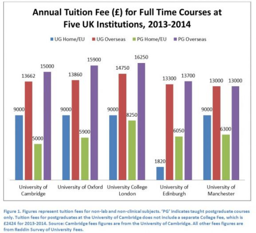 蓝色:本地学生本科学费,红色:国际学生本科学费,绿色:本地学生研究生学费,紫色:国际学生研究生学费。(英国《华闻周刊》微信公众号)