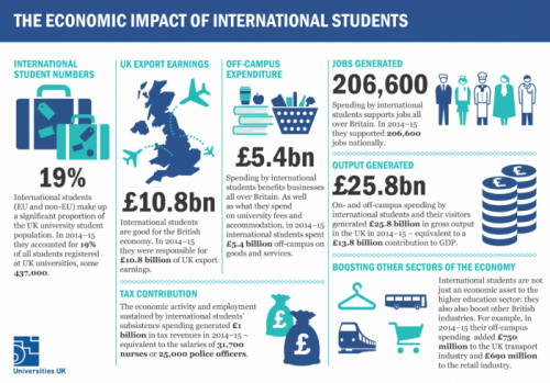2014-2015年,留学生为英国出口收入贡献了108亿英镑;让本地企业创收54亿英镑,这其中还不包括学费和住宿费。