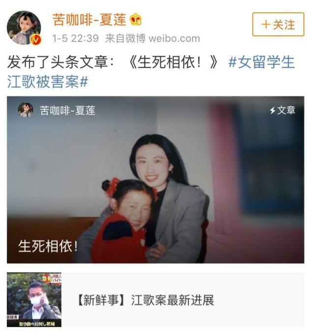 1月5日晚,“下文”客户端记者查询发现,江歌母亲发布文章《生死相依!》。“我的歌儿,日本法庭的判决仅仅还了你清白,并没有还你公道!并没有还我全部真相!”她表示,对江歌的承诺“永不食言”,对江歌的爱“永不后悔”。她对大家的关心表示感谢,并说:“江歌被害案已判决结束,一些指指点点的看客们,也该散了,该取消关注的取消关注,该绕路的绕路吧。”