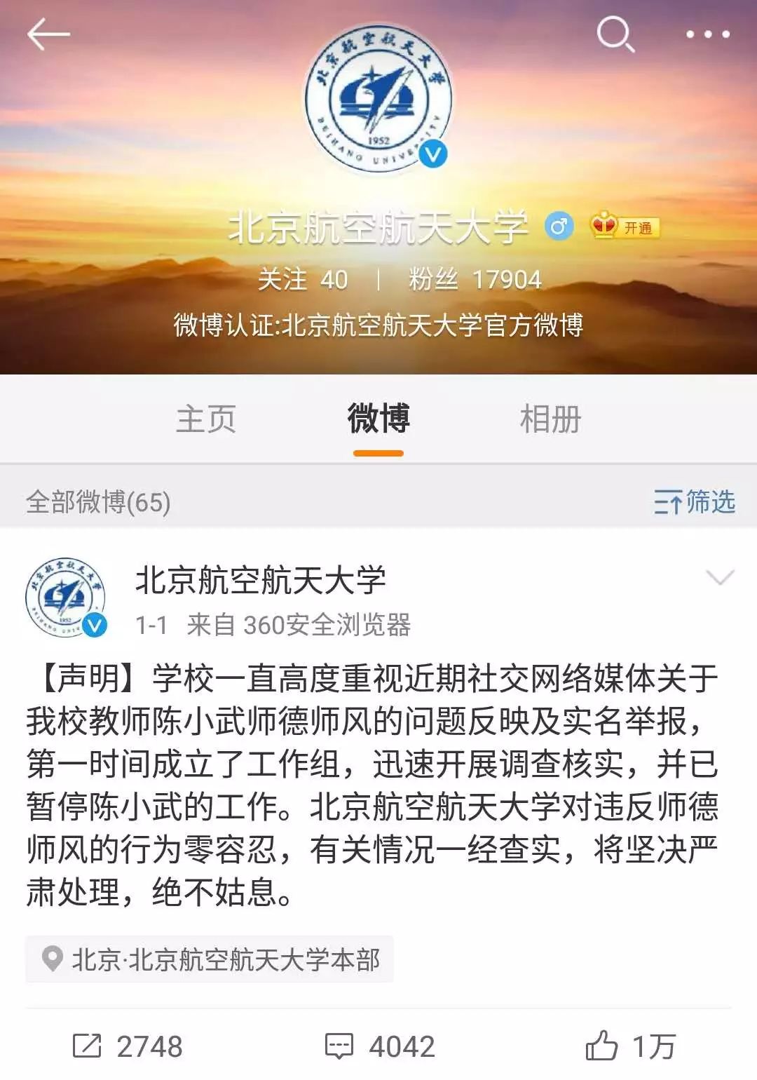 新年第一天,一名女博士在微博实名举报北航教授性骚扰,北航随后成立工作组,开展调查,并已暂停该教授的工作。