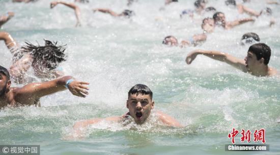 资料图为当地时间1月7日,在悉尼海滩参加游泳比赛的人群。